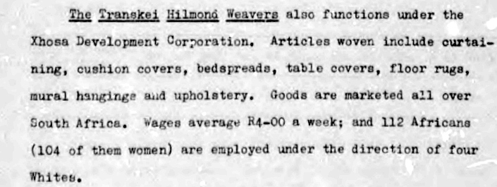 The Transkei Hilmond Weavers workshop financed by the Xhosa Development Corporation was managed by Mrs Lyons and her son who originally had run a similar workshop near Brakpan on Johannesburg’s East Rand.
